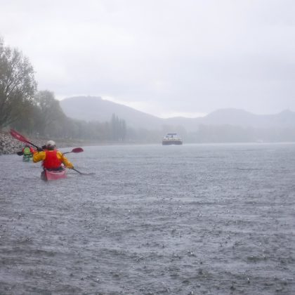 Bei Hochwasser im Kajak ein Stück den Rhein hoch, außer um Bäume auch um Bänke und Papierkörbe kurven, das kostet richtig Energie und verhilft zu +++