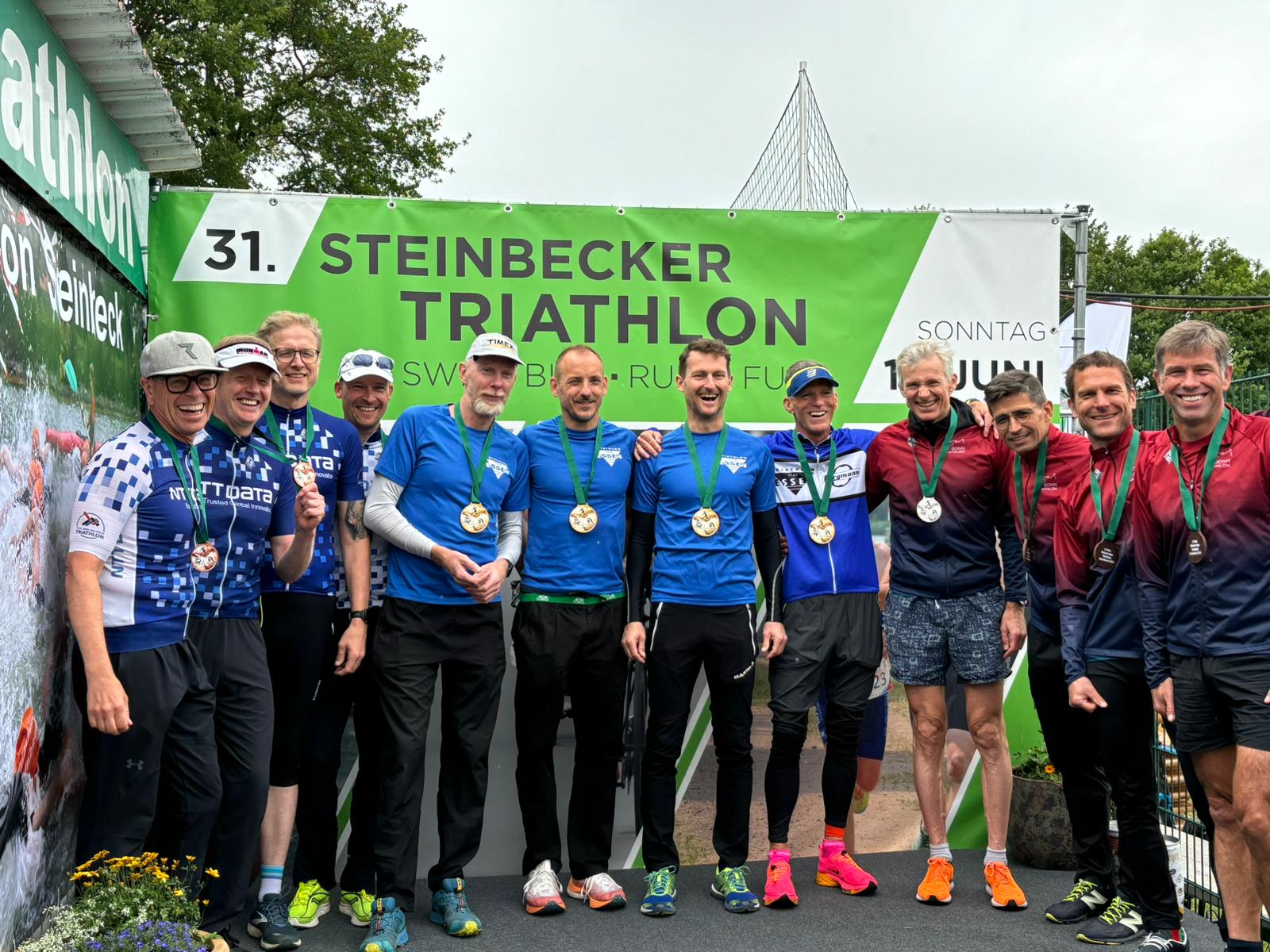 Es fällt auf, dass das „Event-Gelände“ sehr großzügig gehalten und die Wechselzone auf dem lokalen Rasenplatz fast feudal großzügig perfekt angelegt war. Wow! Direkt mal ein fettes Plus für Steinbeck! Zu den Strecken: 1.500m im Mittellandkanal, auch herrlich aufregend gegenüber dem Perlenkettenschwimmen in den Freibädern bisher, drei Runden à 14km Rad, mit einer signifikanten Steigung, und zwei Runden Laufen am Kanal; klassisch olympisch also!