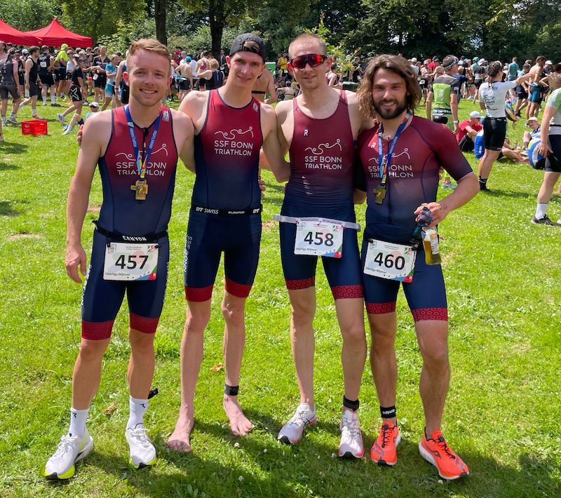 Kommen wir erst zu den Damen: Das Schwimmen verlief bei allen dreien solide und so kamen die Bonnerinnen im hinteren Mittelfeld in die Wechselzone. Der Weg in die Wechselzone führte bergan, wo genug Zeit blieb, den Neoprenanzug bis zur Hüfte abzustreifen. Auf der Radstrecke wurde dann bei allen der Turbo gezündet, wobei die Sonne schon ordentlich Kraft hatte. Anne und Lea kamen fast zeitgleich in die zweite Wechselzone und machten sich auf die 21km in knallendem Sonnenschein. Kurze Zeit später folgte auch Tina. Anne zeigte ihre Laufstärke dann noch mal von feinster Seite und kam als 7. Frau ins Ziel. Lea (15) und Tina (28) komplettierten das Mannschaftsergebnis zu einem klasse 6. Gesamtplatz für das Team der NRW Liga Damen! Perfekt! Nun sind wir gespannt auf den Teamsprint in Krefeld am 25.08.2024.