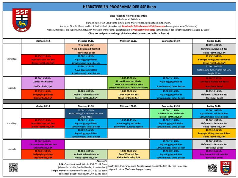 • ALLGEMEINES: Die Kurse sind grundsätzlich für einen definierten Kursabschnitt für eine verbindliche Anzahl an Kurseinheiten für SSF Mitglieder und auch für Nicht-Mitglieder buchbar. Nähere Informationen zu Kursinhalten, Übungsleiterinnen und Preisen erhalten Sie mit Klick auf die jeweilige Kurskachel (siehe unten), hier können Sie sich auch direkt online für den Kurs anmelden.