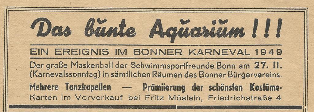 - Am 27.02.1949 veranstalten die SSF Bonn „Das bunte Aquarium“. Dies ist der Auftakt für viele erfolgreiche Karnevalsveranstaltungen des Vereins in den Folgejahren.