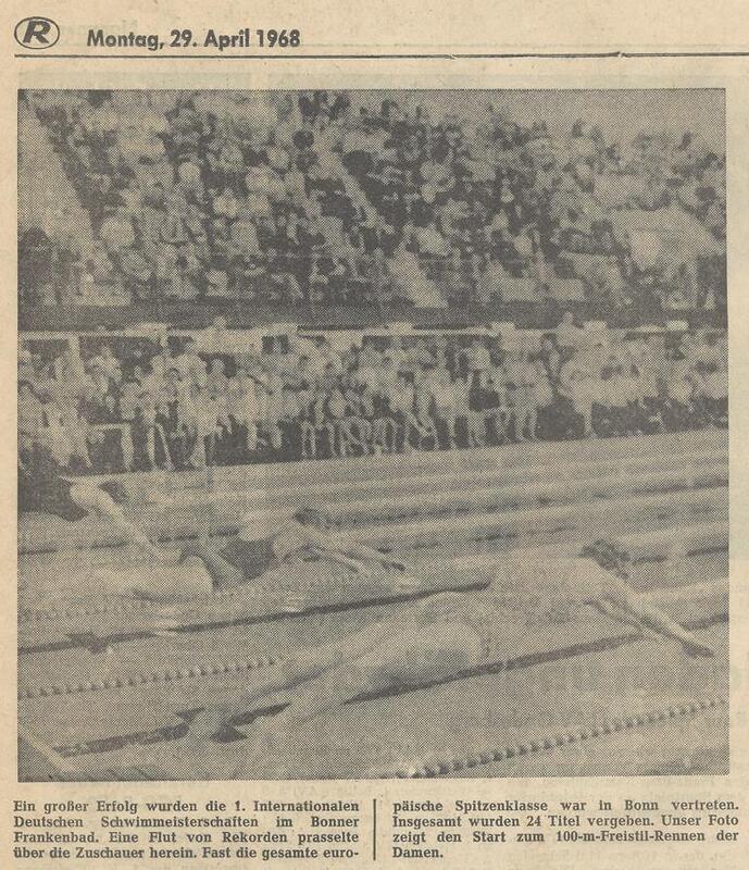 - Vom 26. – 28.04. richten die SSF Bonn im Frankenbad die ersten Internationalen Deutschen Meisterschaften im Schwimmen aus.
