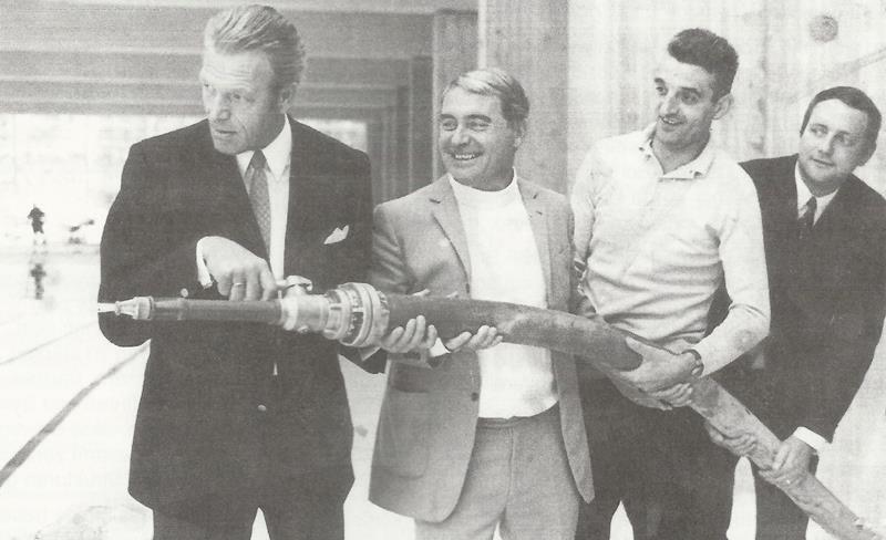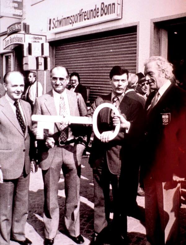 - Durch die vorhandenen internationalen Verbindungen unseres Vorsitzenden und mit Hilfe der Deutschen Lufthansa war ein besonderer Gag für die "Weihe" des Bades möglich. Wasser aus den Olympiaschwimmbecken von Amsterdam, Los Angeles, Berlin, Helsinki, Rom, Tokio, Melbourne und Mexico, wurde von den Medaillengewinnern dieser Spiele, Erich Rademacher, Erwin Sietos, Ernst Küppers, Leni Henze, Gisela Jacob, Ursula Happe, Gerhard Hetz und Michael Holthaus in das Sportbecken geschüttet.